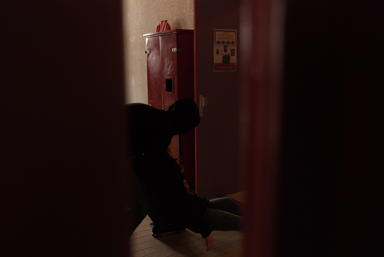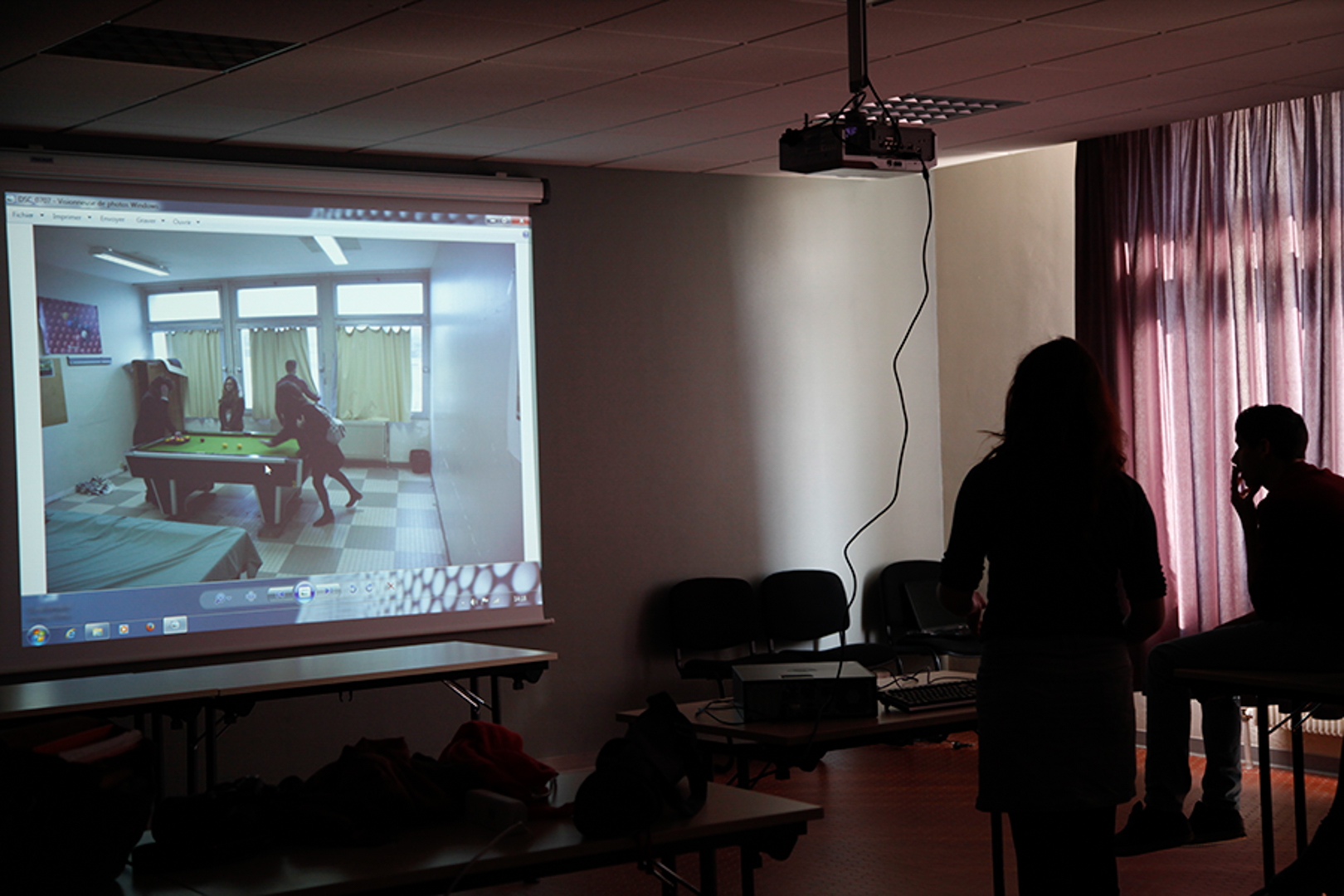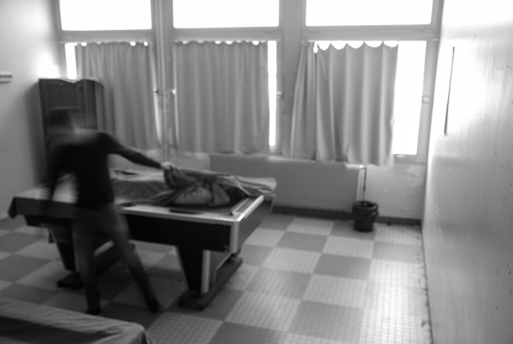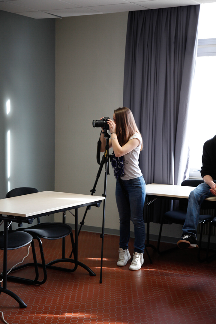 Les séances sur le faux documentaire se sont déroulées en deux temps. Dans un premier temps, chaque groupe a réalisé une séance dans laquelle s’est dessiné une trame narrative concernant le faux documentaire et les groupes ont réalisé les premières photographies. Les groupes prenaient appuie sur ce qui avait été réalisé par les groupes précédents afin de continuer la trame narrative (un meurtre dans le lycée). Les élèves devaient créer et imiter les codes d’images/preuves : caméra de surveillance, photographies prises à la volée, portraits anthropométriques, photographies judiciaires etc. Le deuxième temps de l’atelier était consacré à un premier tri de ces photographies, à une position critique de celles-ci (les codes sont-ils reconnaissables ?). Les photographies jugées ratées lors des premières séances ont été refaite à ce moment-ci.