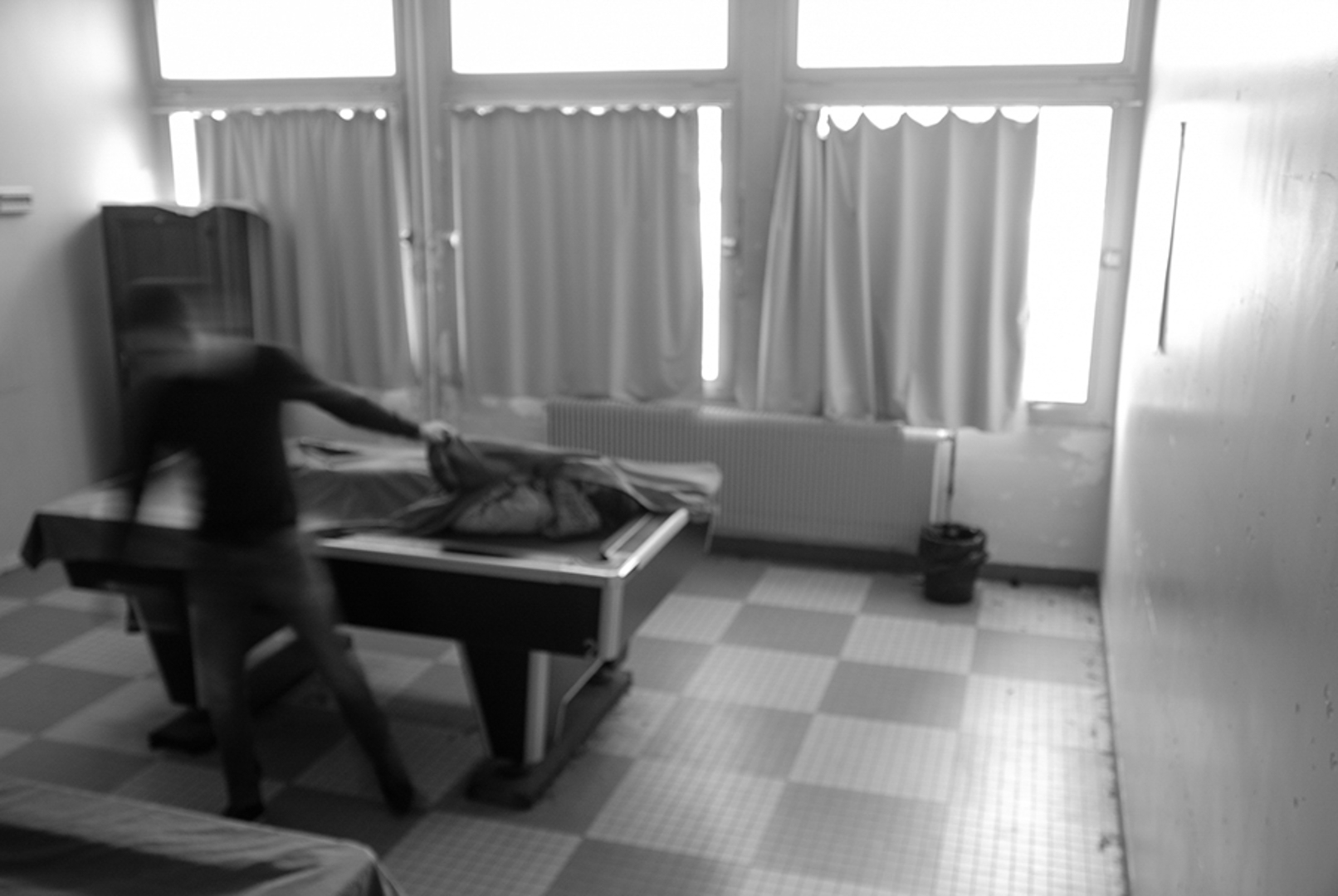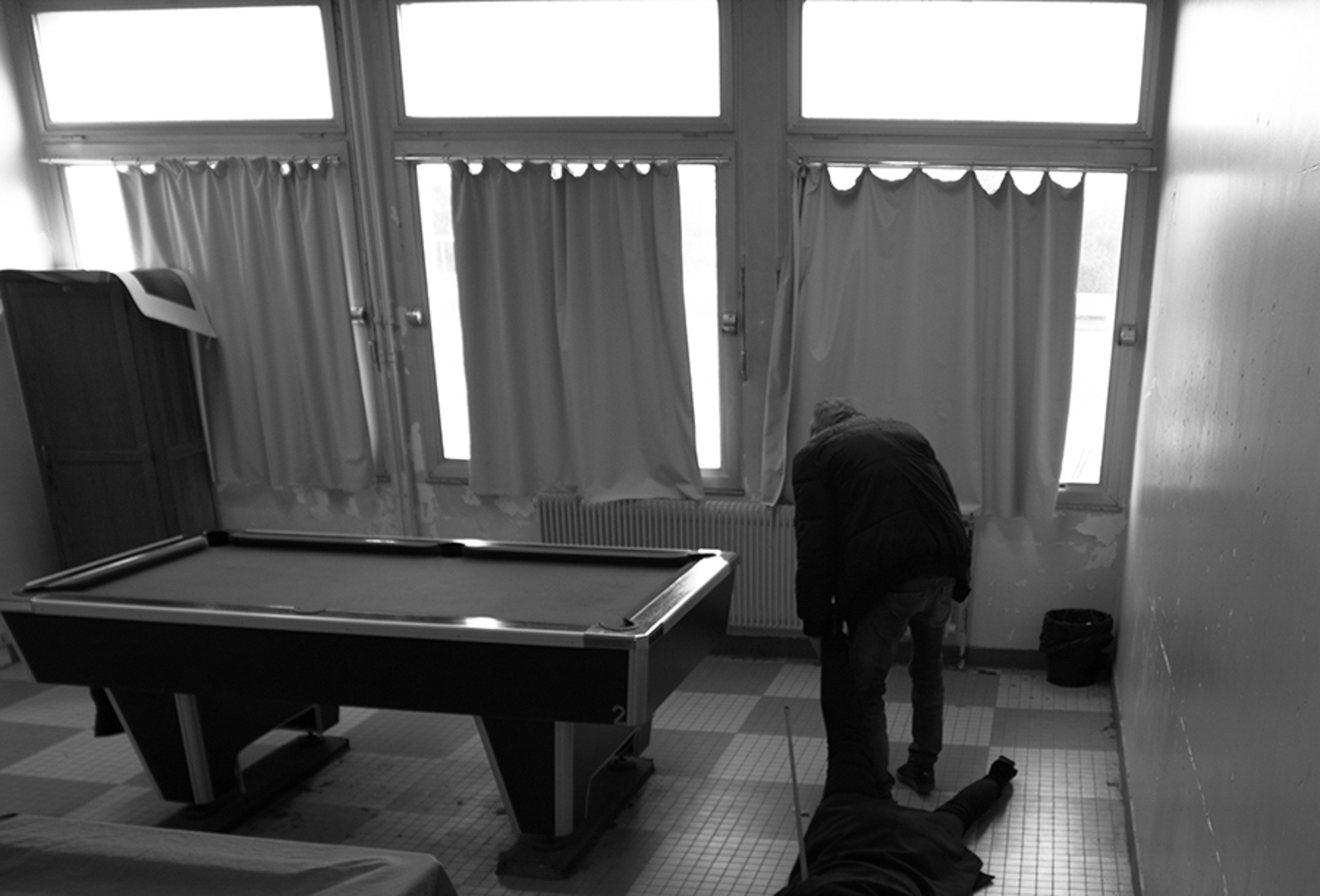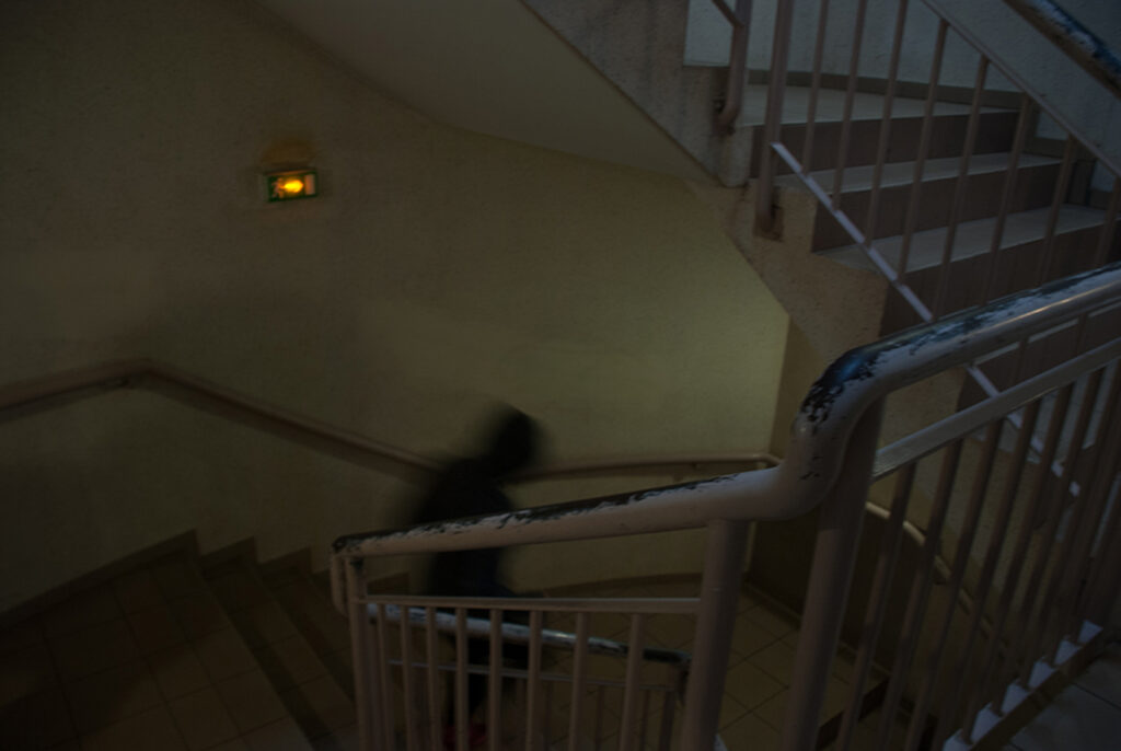 Les séances sur le faux documentaire se sont déroulées en deux temps. Dans un premier temps, chaque groupe a réalisé une séance dans laquelle s’est dessiné une trame narrative concernant le faux documentaire et les groupes ont réalisé les premières photographies. Les groupes prenaient appuie sur ce qui avait été réalisé par les groupes précédents afin de continuer la trame narrative (un meurtre dans le lycée). Les élèves devaient créer et imiter les codes d’images/preuves : caméra de surveillance, photographies prises à la volée, portraits anthropométriques, photographies judiciaires etc. Le deuxième temps de l’atelier était consacré à un premier tri de ces photographies, à une position critique de celles-ci (les codes sont-ils reconnaissables ?). Les photographies jugées ratées lors des premières séances ont été refaite à ce moment-ci.